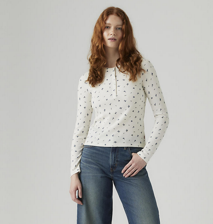 Your everyday wardrobe hero, the Dana Henley is designed with a half placket, a flattering slim fit and signature Red Tab. Featuring a super cute ditsy blue floral print.